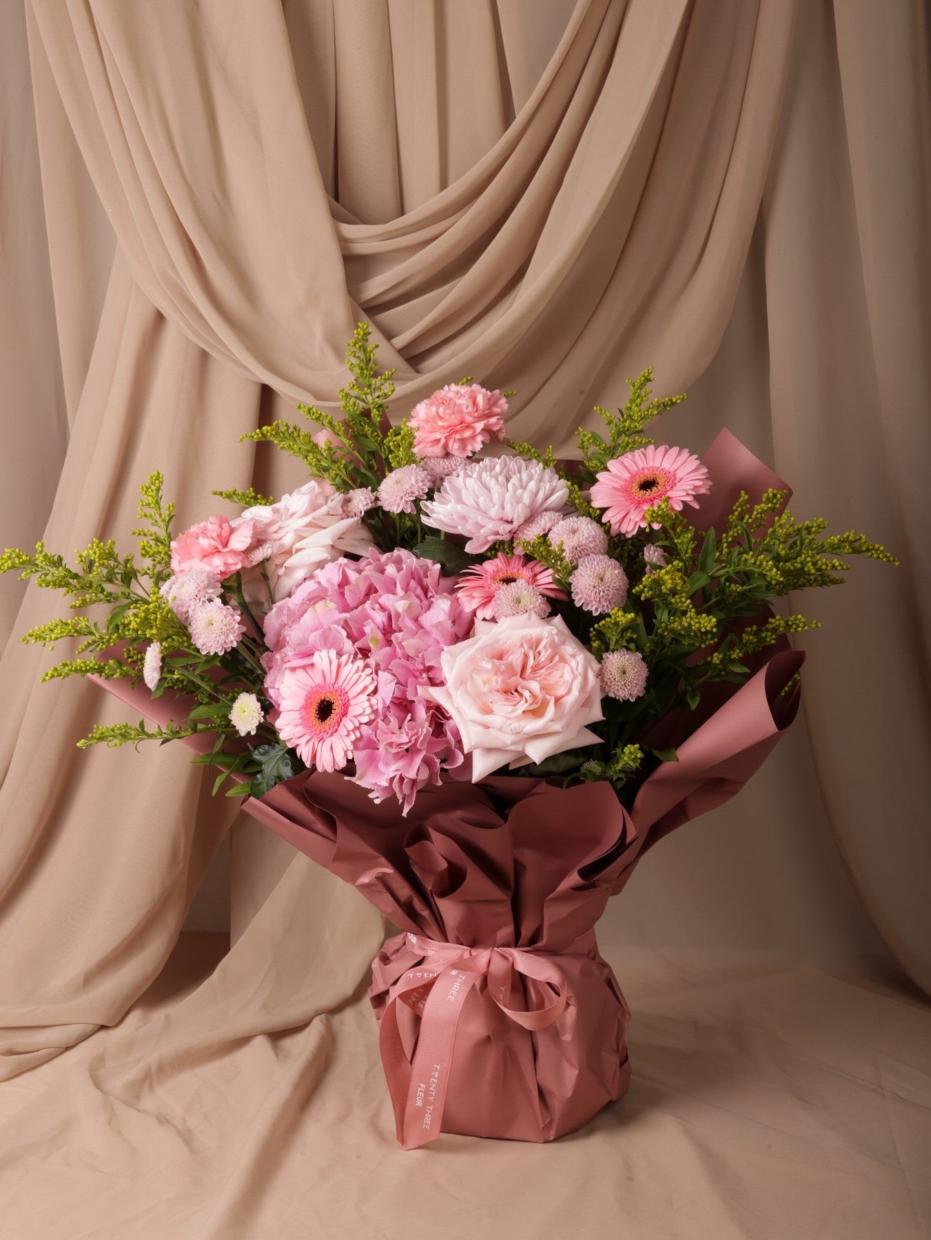 ناعمة وراقية، باقة "بلووم روزي" تحتفل بجمال الألوان الوردية. تتكوّن من هايدرنجا وردية، ورود حدائق، قرنفل، وجربيرا، مع لمسات من سوليداجو الأصفر وتغليف بدرجات الوردي الغامق. مثالية للمناسبات الخاصة أو لإضفاء البهجة على يوم أحدهم.