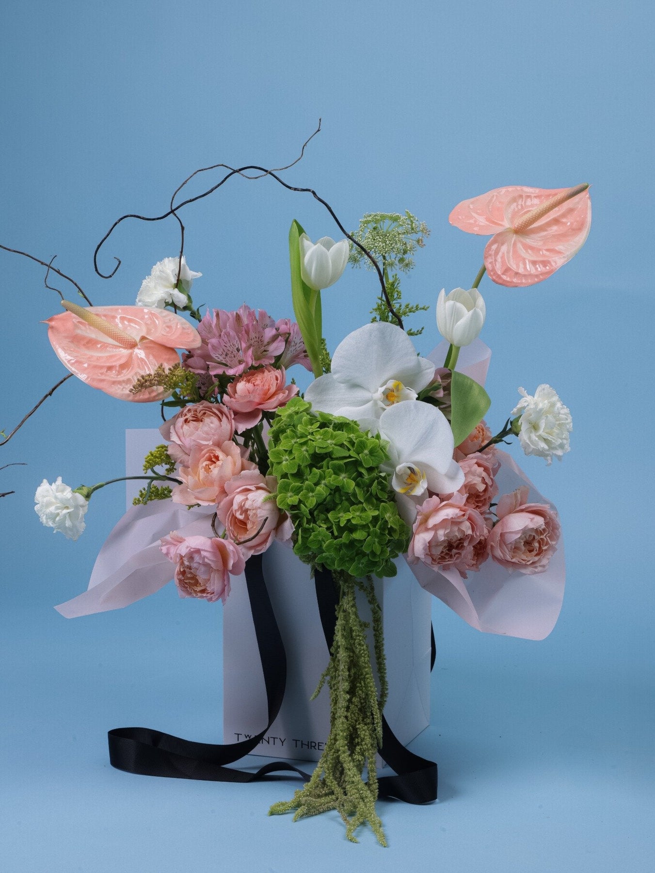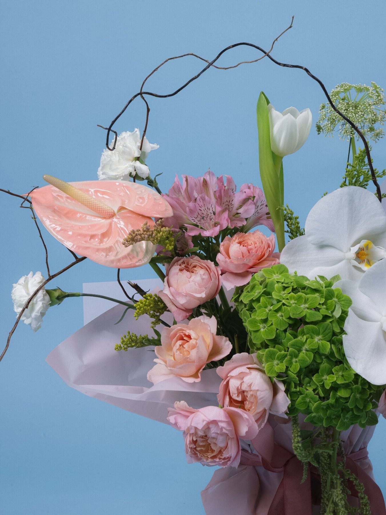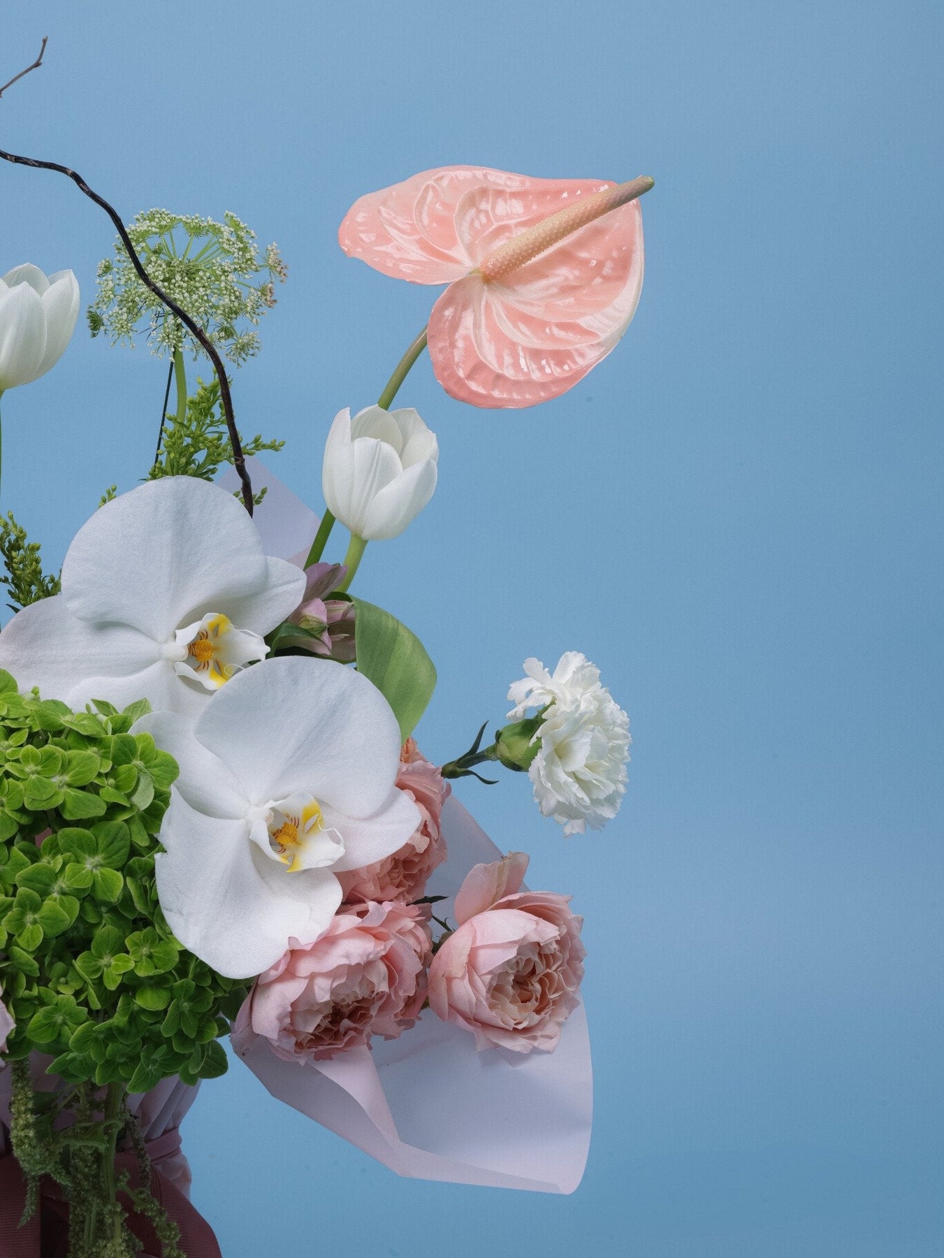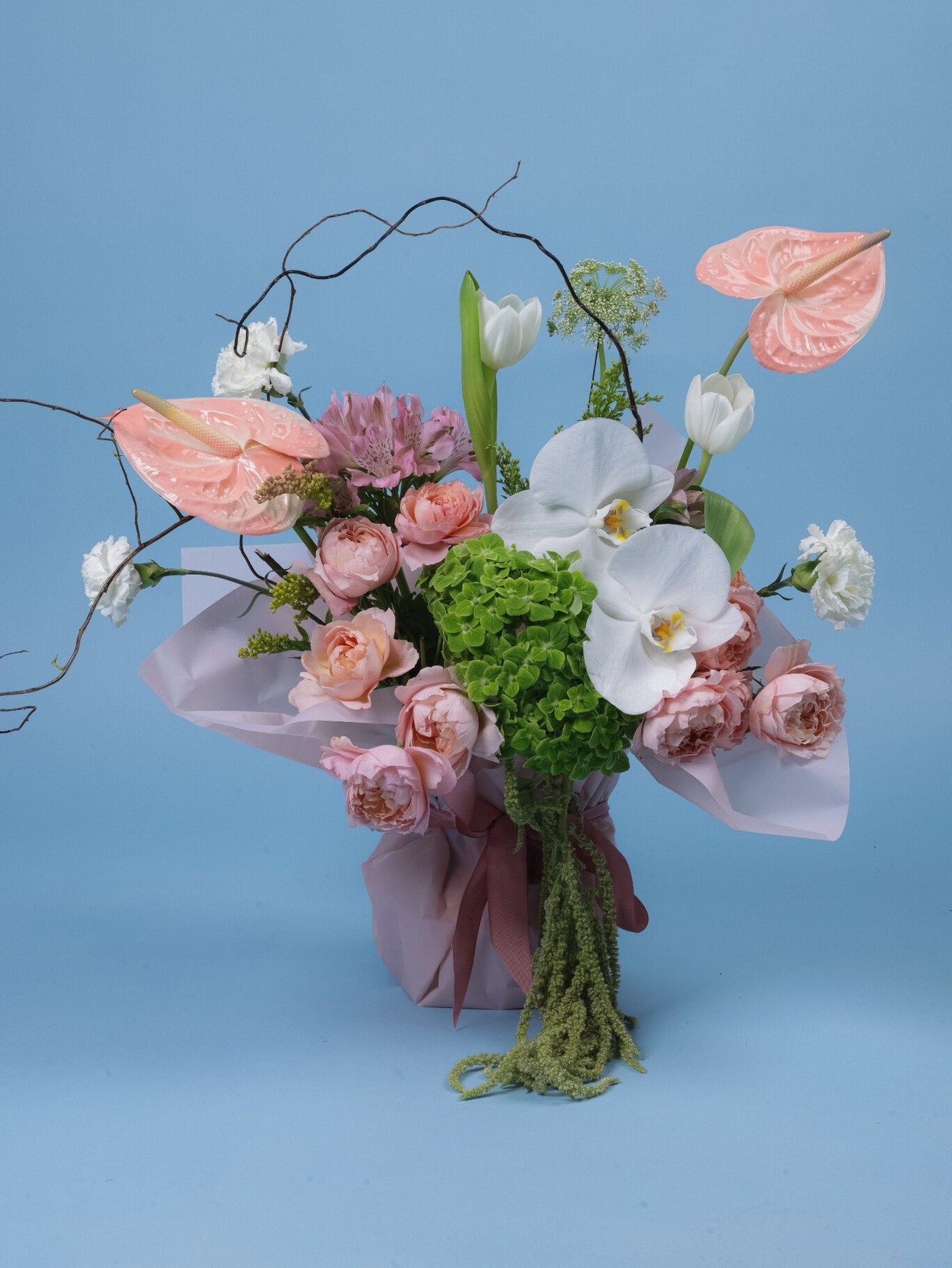 مزيج رومانسي من الورود الوردية الناعمة، الأوركيد الأبيض، التيوليب، الأنثوريوم، ولمسات من الزرع الطبيعي. تنسيق مثالي للمناسبات الخاصة مثل الذكرى السنوية أو بداية جديدة أو تعبير بسيط عن الحب والاهتمام.