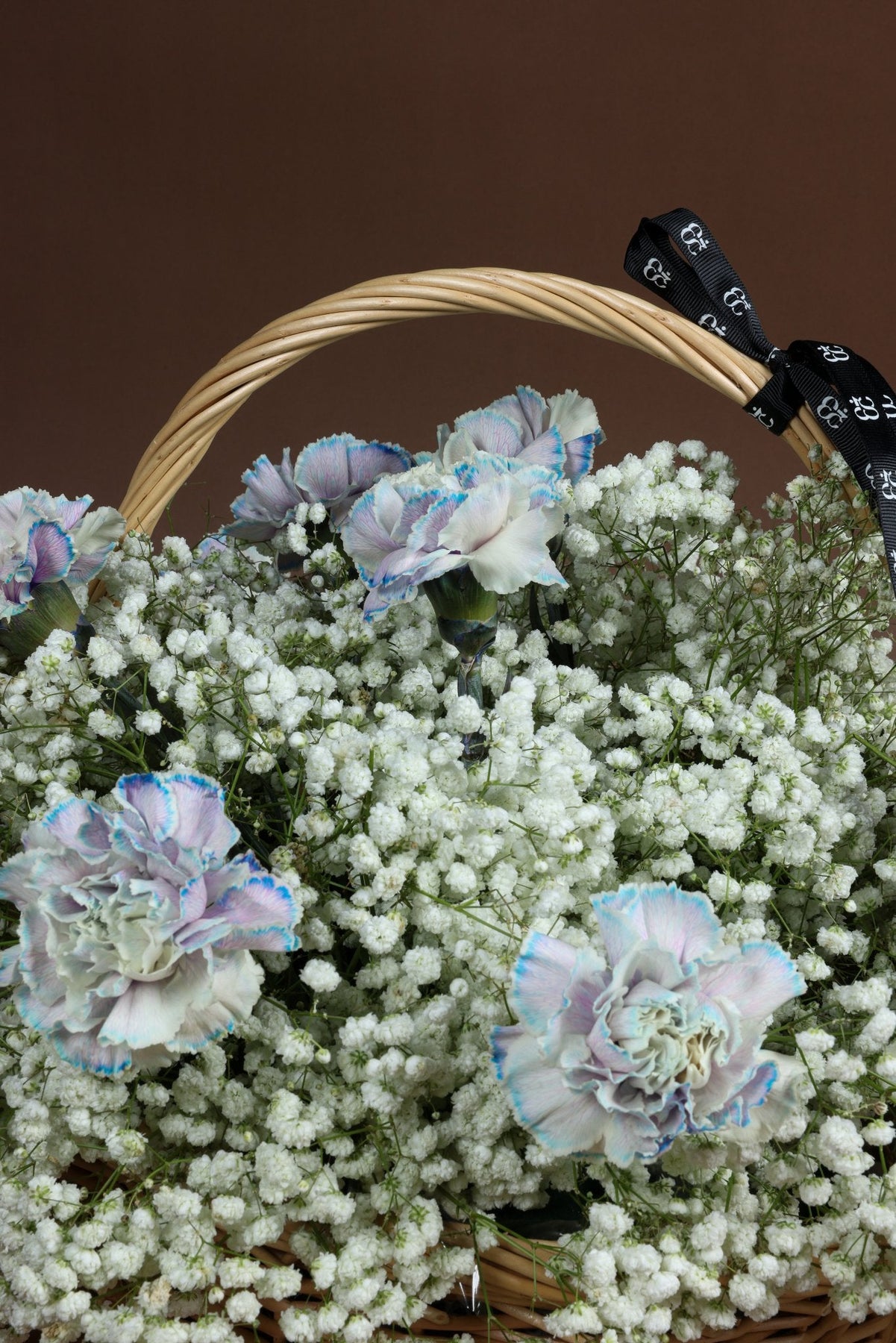 A delicate basket filled with white gypsophila (baby’s breath) and accented with unique pastel-edged carnations, creating a dreamy and enchanting look. Perfect for elegant gifts and unforgettable occasions.