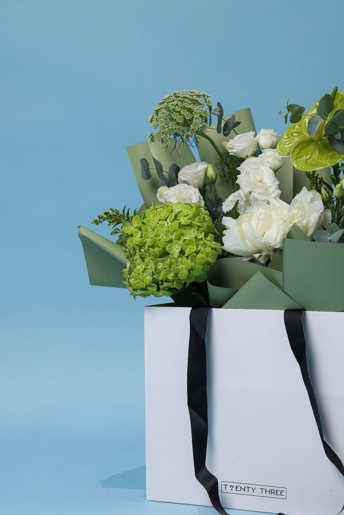 باقة أنيقة بألوان خضراء وبيضاء منعشة، تضم هدرانج، ليزيانثس، ورود بيضاء، وأزهار الملكة آن مع لمسات من اليوكاليبتوس. مغلفة بورق أخضر غير لامع وتقدم في حقيبتنا الفاخرة — تعبير راقٍ عن الهدوء والفخامة.