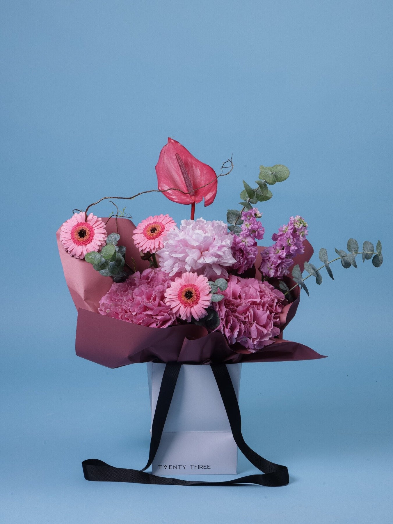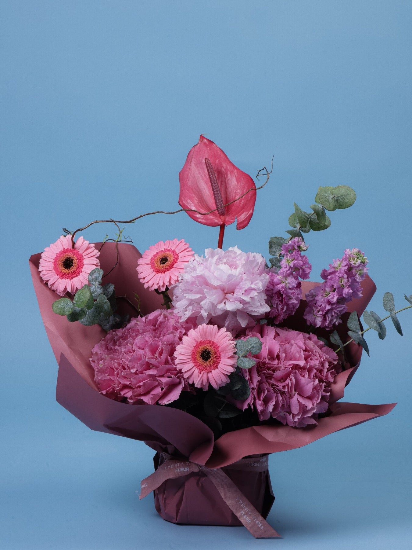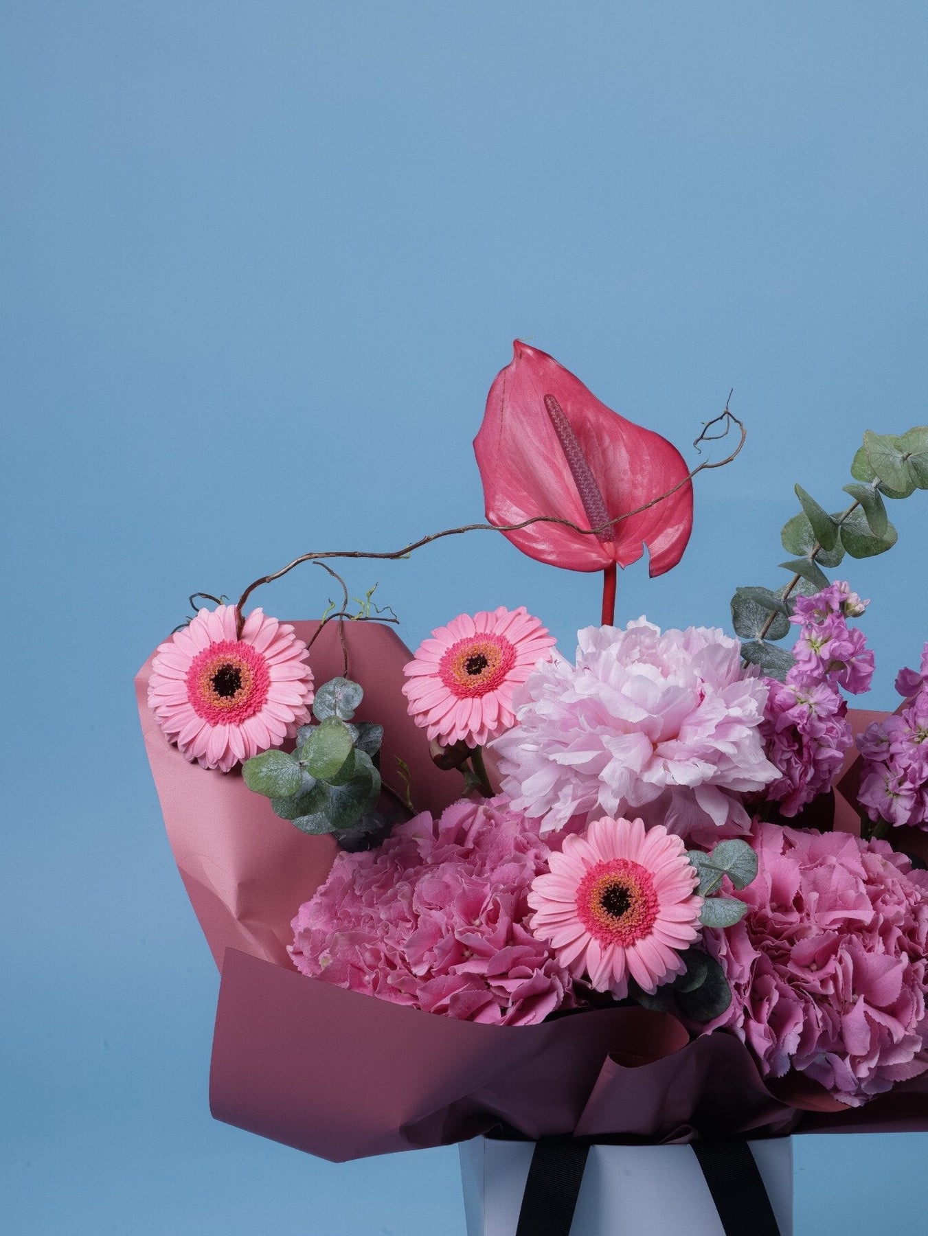 مزيج مبتهج وجذاب من الجربيرا، الهايدرانجيا، الفاونيا، والأنثوريوم الوردي. تنسيق ينبض بالحب والفرح، مثالي لأعياد الميلاد، التهاني، أو لإدخال البهجة على يوم أحدهم.