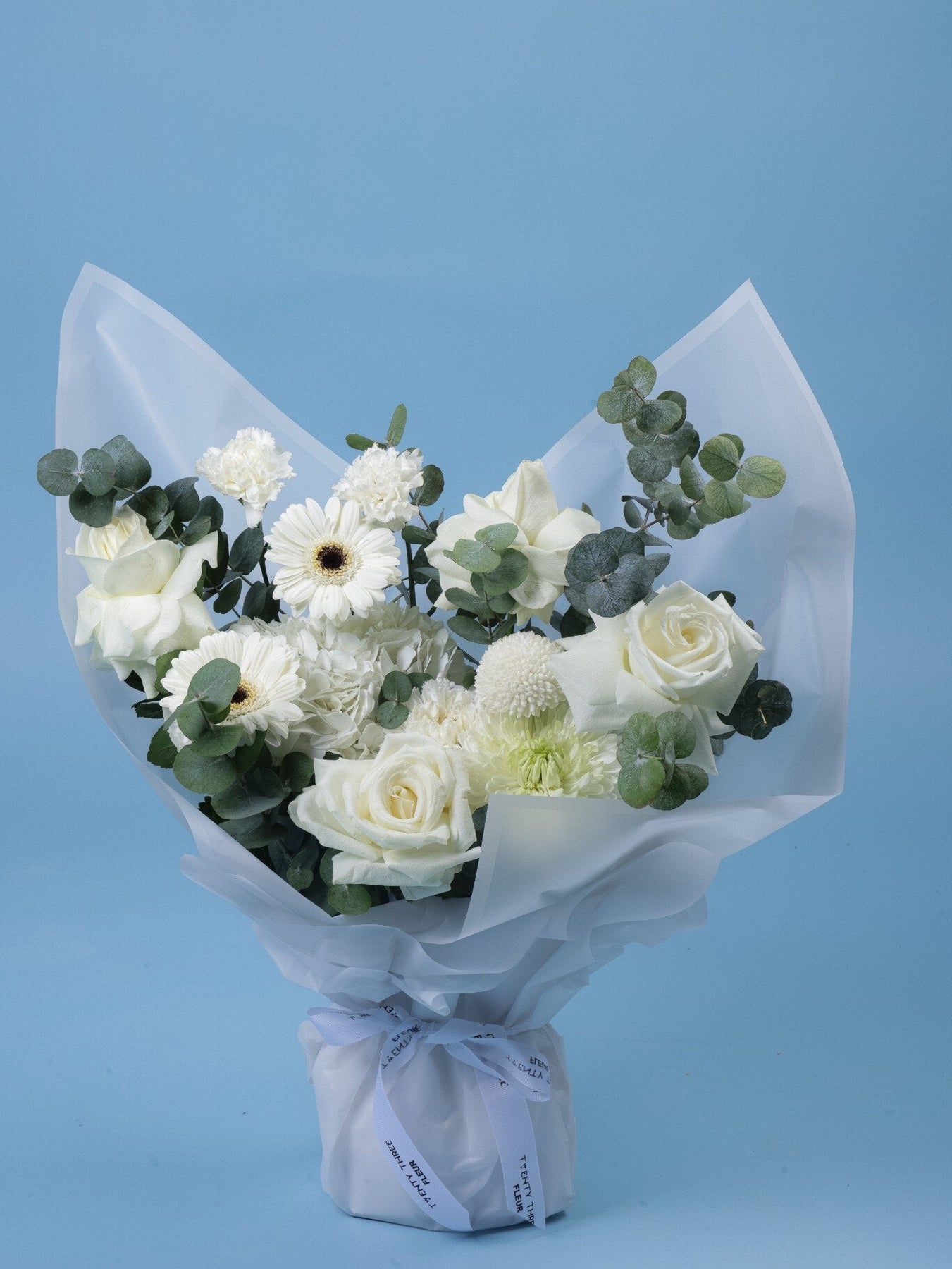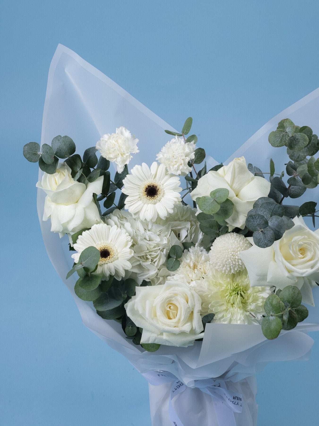 تنسيق من الزهور البيضاء بالكامل—الورد، القرنفل، الجربيرا، والأقحوان—مع لمسات من اليوكاليبتوس الأخضر. تصميم أنيق يعكس النقاء والهدوء والفخامة في كل مناسبة.