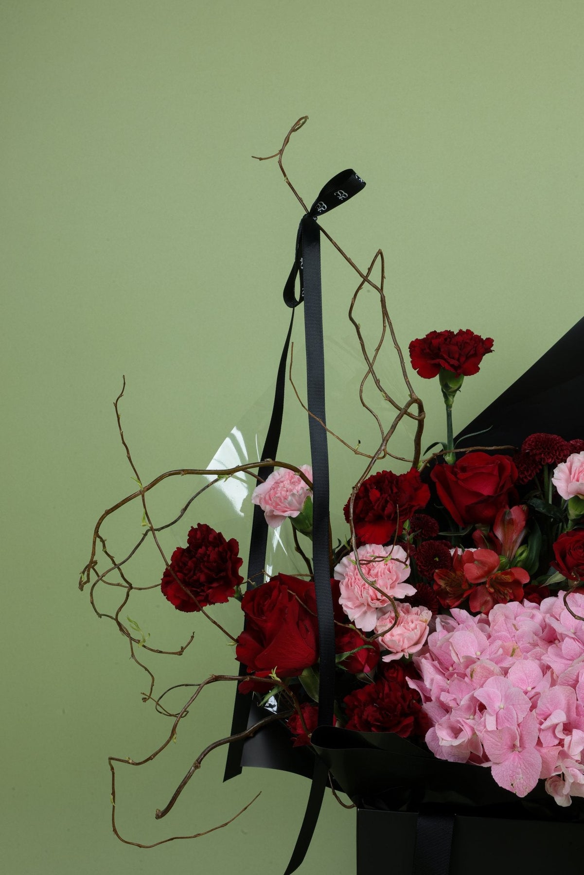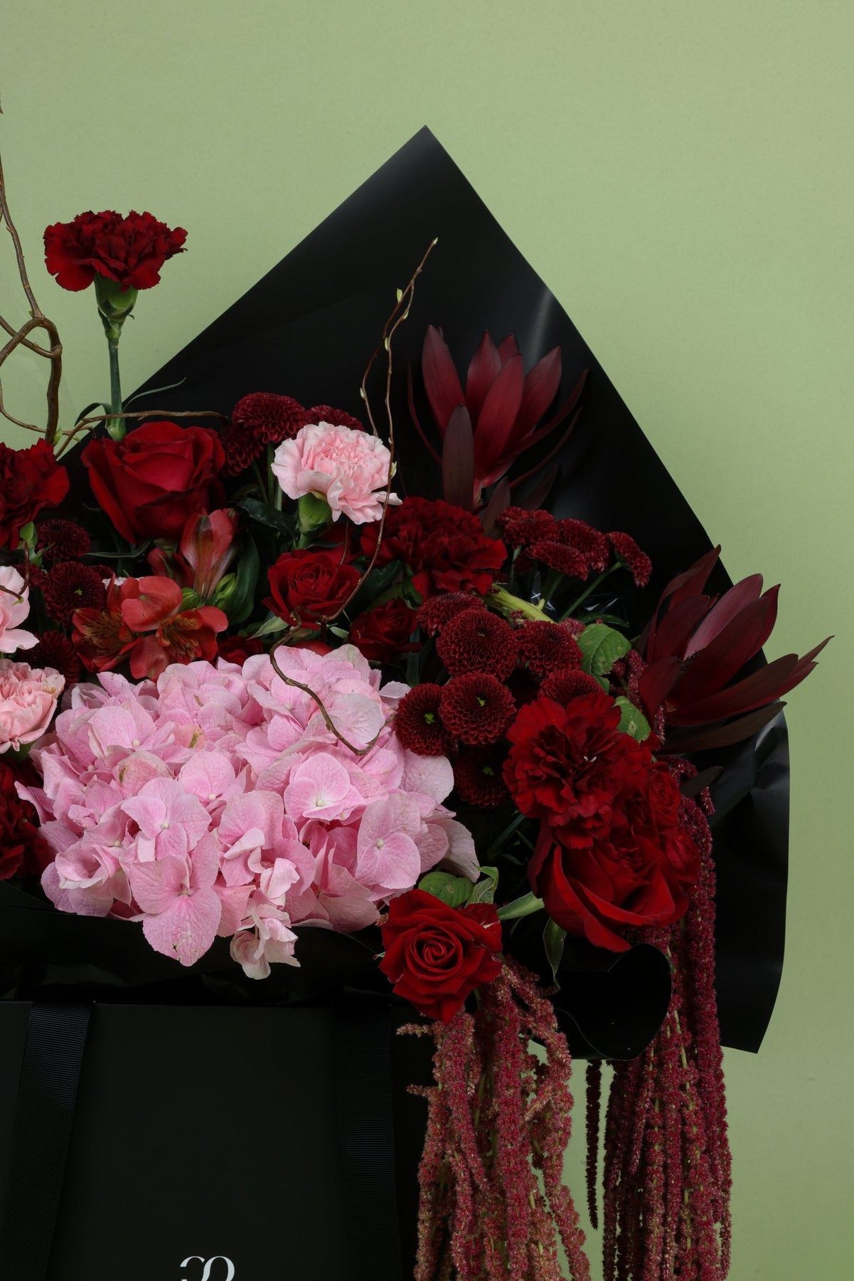 A striking bouquet featuring red roses, carnations, chrysanthemums, pink hydrangea, and amaranthus, enhanced with artistic branches for a dramatic finish. Bold, luxurious, and unforgettable — designed for grand gestures and special occasions.