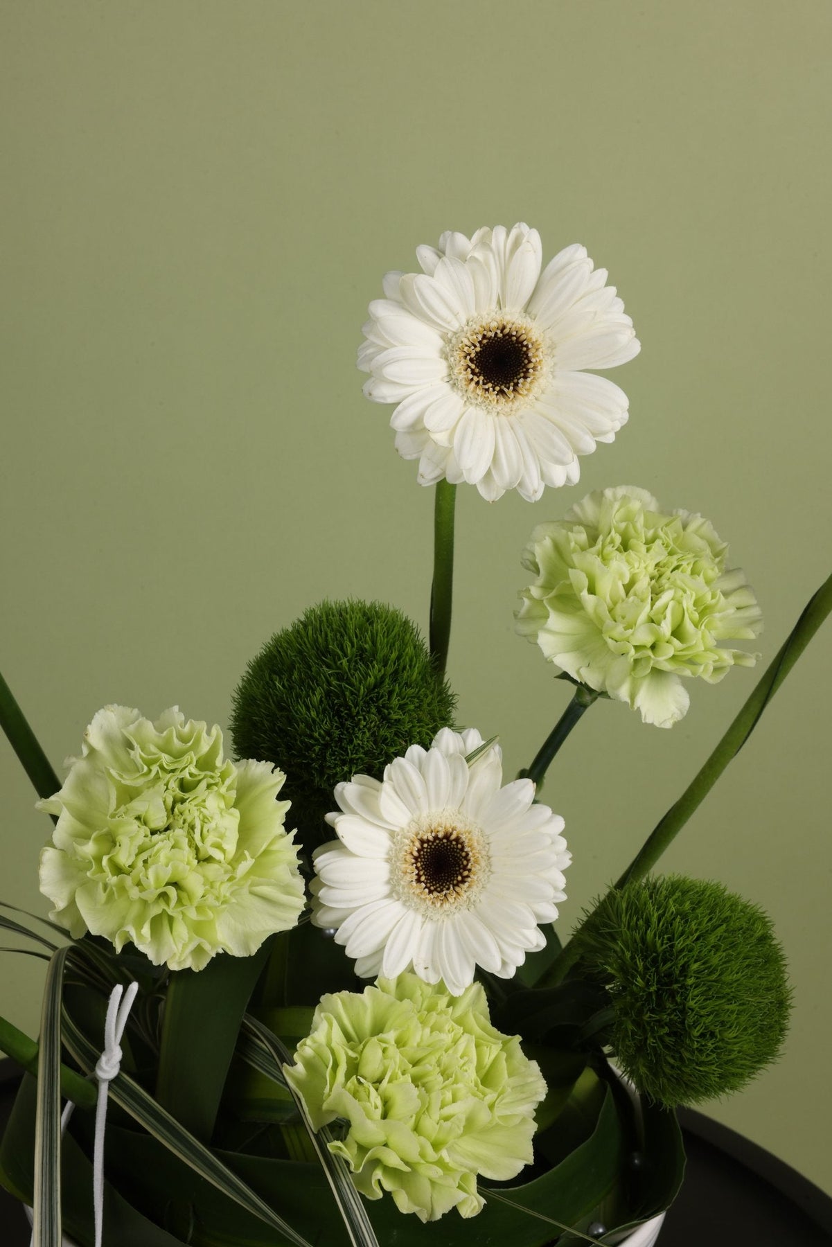 A modern minimalist arrangement featuring white gerbera daisies, green carnations, and green trick dianthus, styled in a chic white Vase. Designed with balance and elegance — perfect for contemporary spaces and refined gifting.