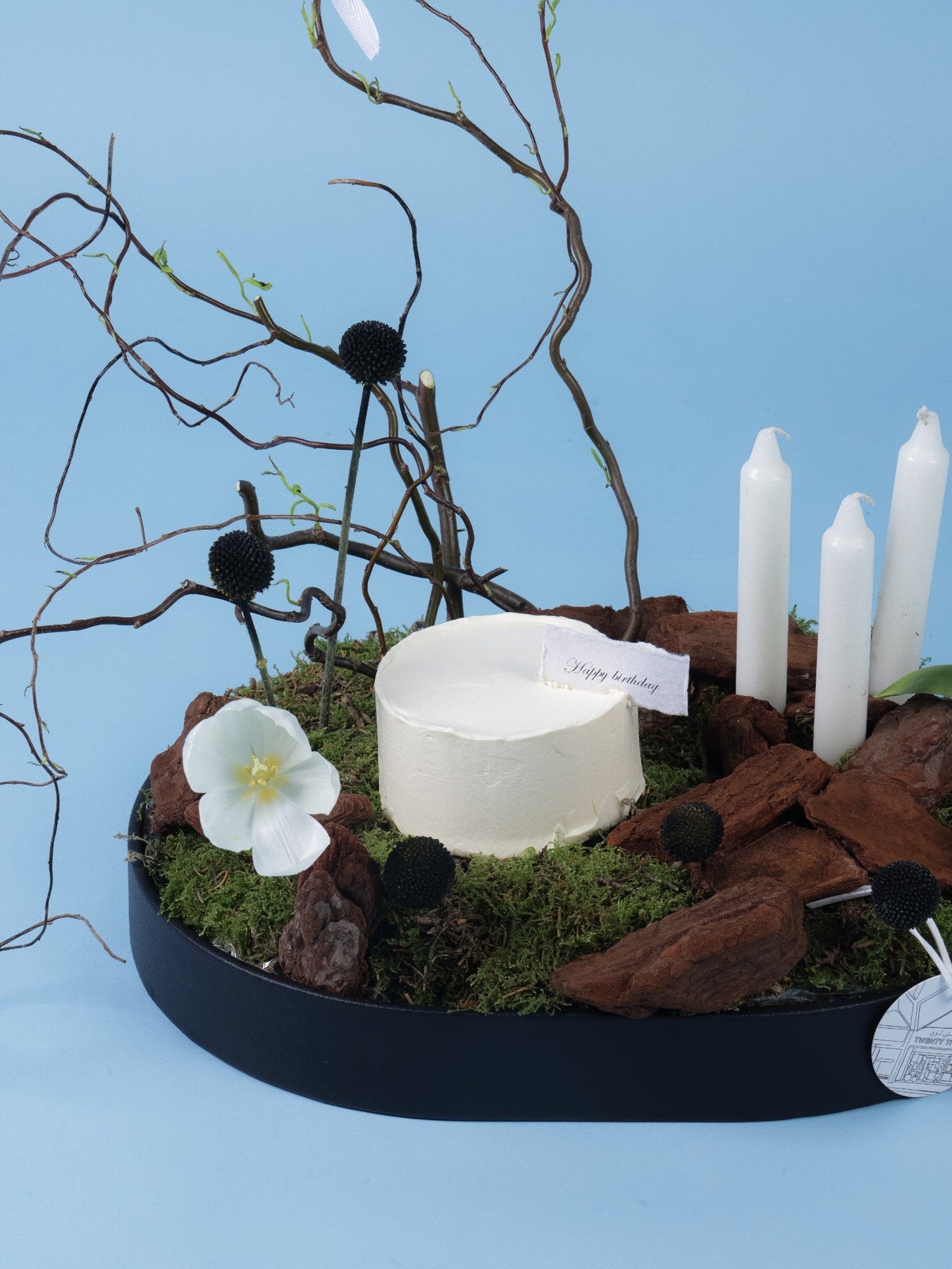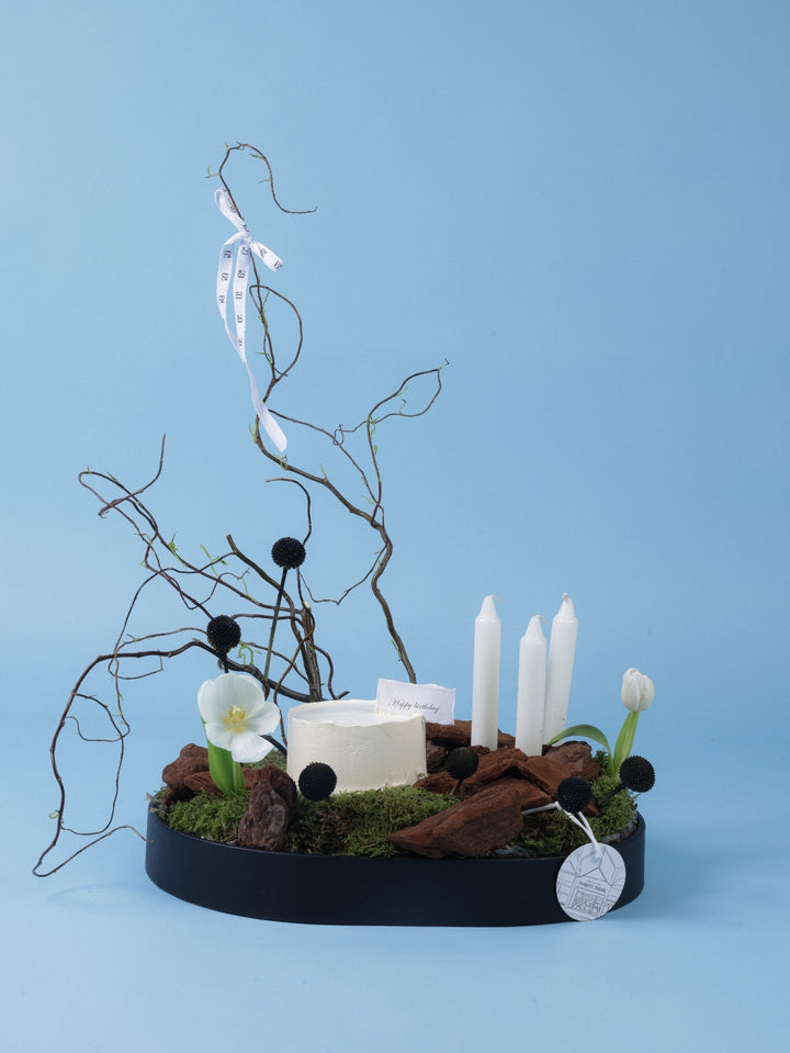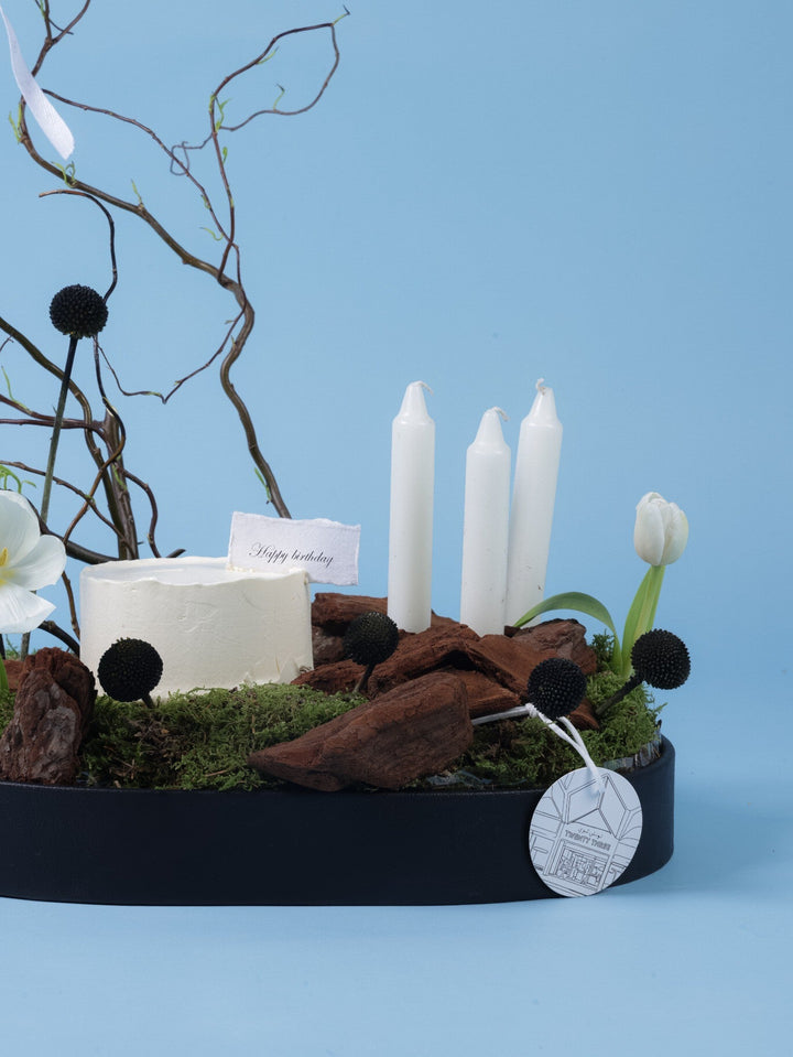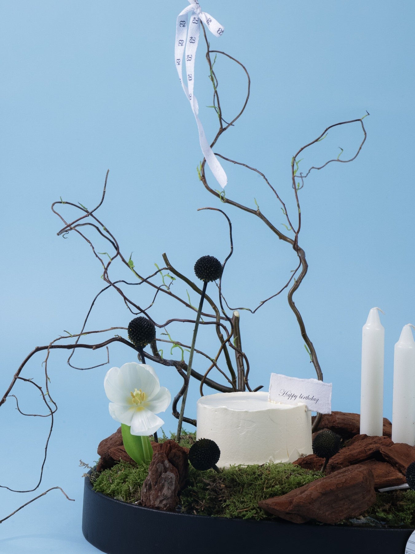 تنسيق عيد ميلاد فني وعصري مع كيك أبيض بسيط، توليب أبيض، سكابيوزا سوداء، فروع متعرجة وشموع، كلها مرتبة فوق قاعدة من الطحالب الطبيعية. مزيج أنيق بين الطبيعة والفخامة.