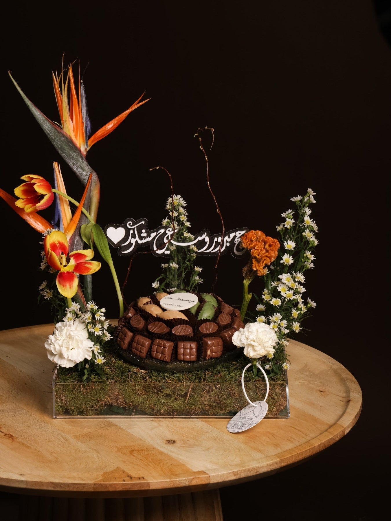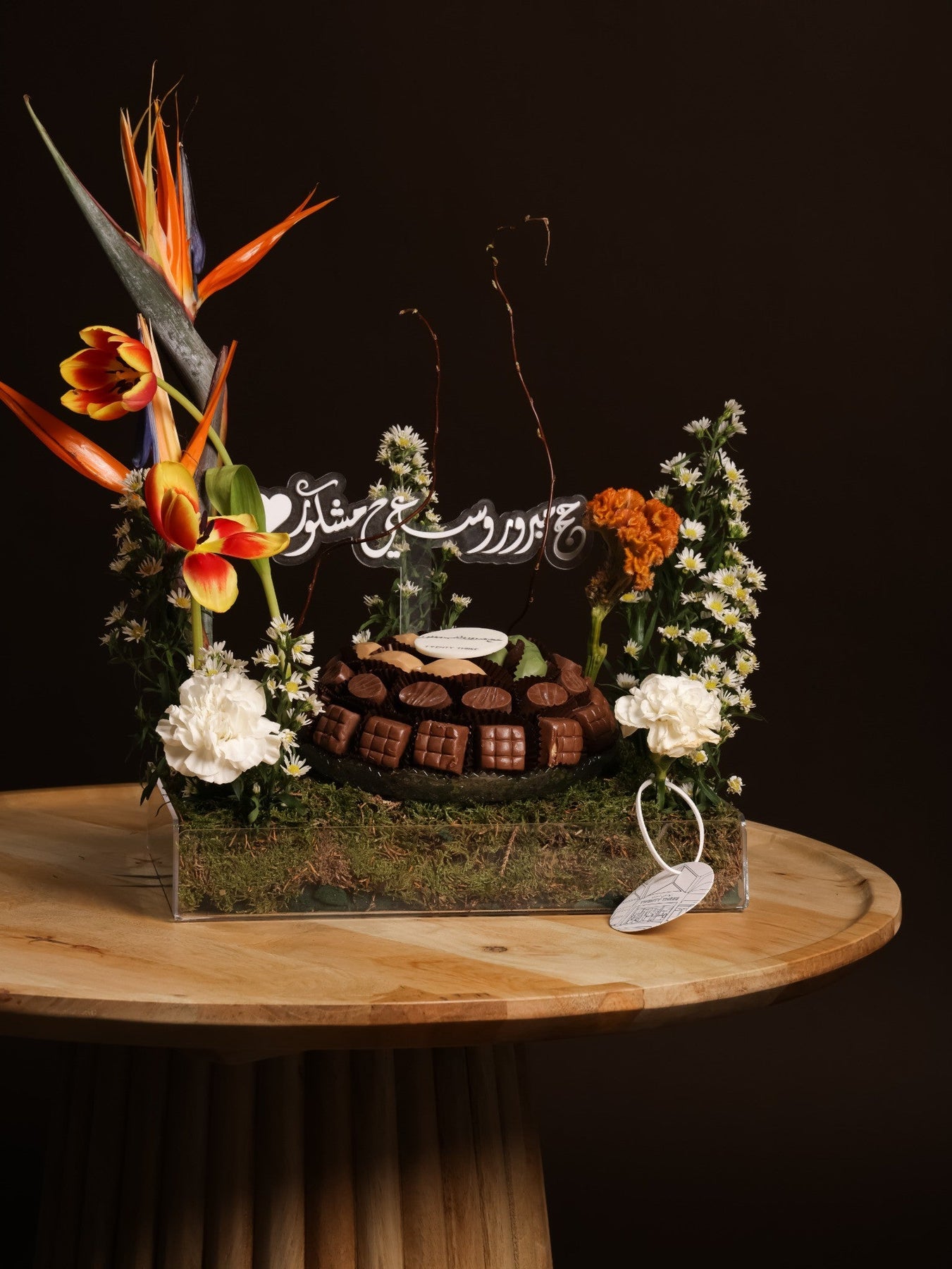 تراي يجمع بين زهور استوائية مثل طائر الجنة والتوليب والبابونج مع تشكيلة شوكولاتة فاخرة على قاعدة من العشب الطبيعي. خيار مثالي لإهداء الفرح والحلاوة.