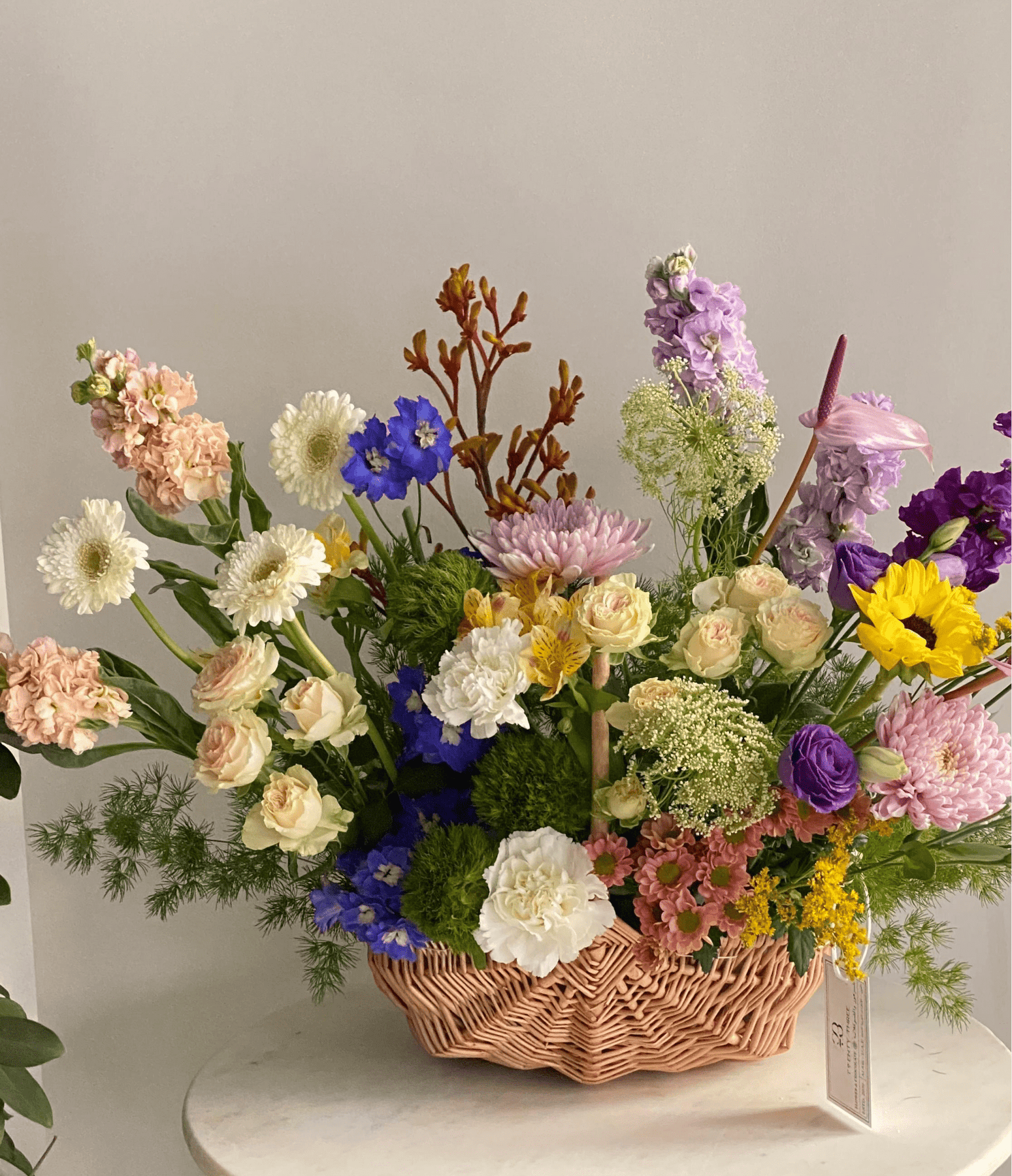 هذه السلة تحتوي على تشكيلة زهور رائعة من الجربيرا، القرنفل، الورد، والدلفينيوم وغيرها — مثالية للأجواء المبهجة.