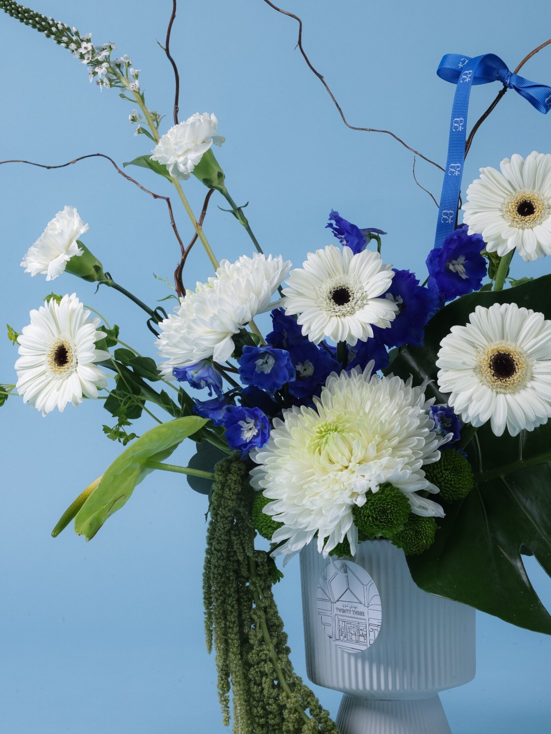 تنسيق زهور مميز يدمج بين الجيربيرا البيضاء، والأقحوان الناصع، والدلفينيوم الأزرق العميق. يُعرض في فازة سيراميك بيضاء بتصميم مضلع وطابع معماري أنيق. مثالي للمناسبات الرسمية أو كهدية ترحيب راقية.