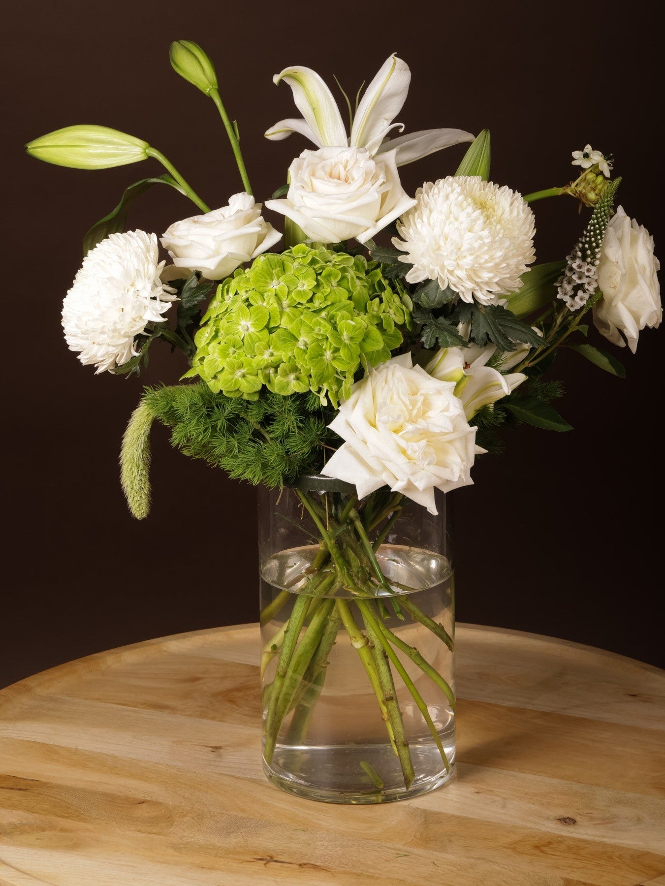 مزهرية عيد أنيقة تضم زنبق أبيض، ورد أبيض، أقحوان، وهدرانج أخضر، مصممة داخل فازة زجاجية شفافة عالية. تنسيق راقٍ وهادئ لأجواء العيد.
