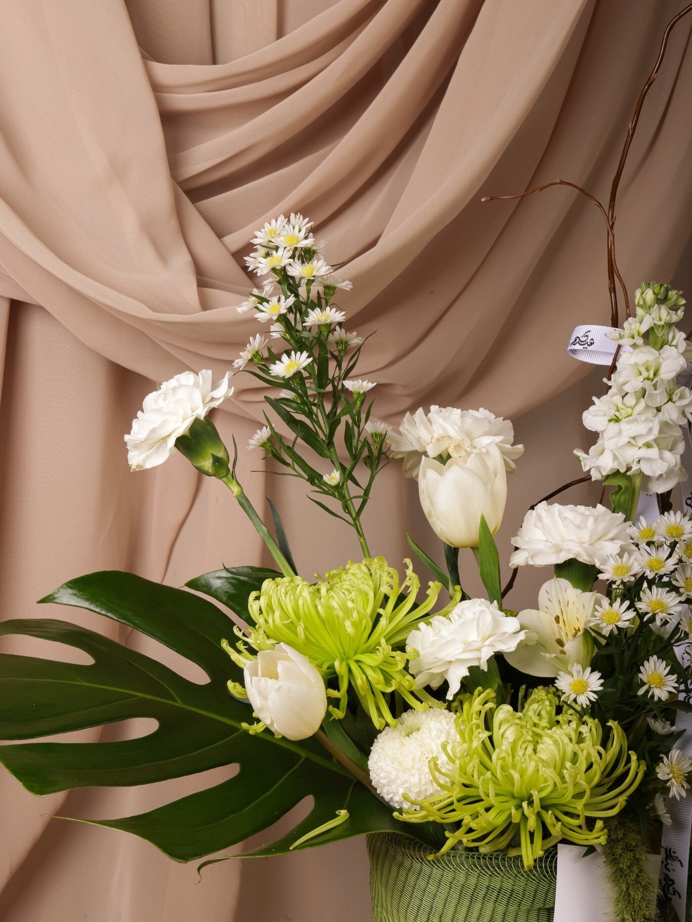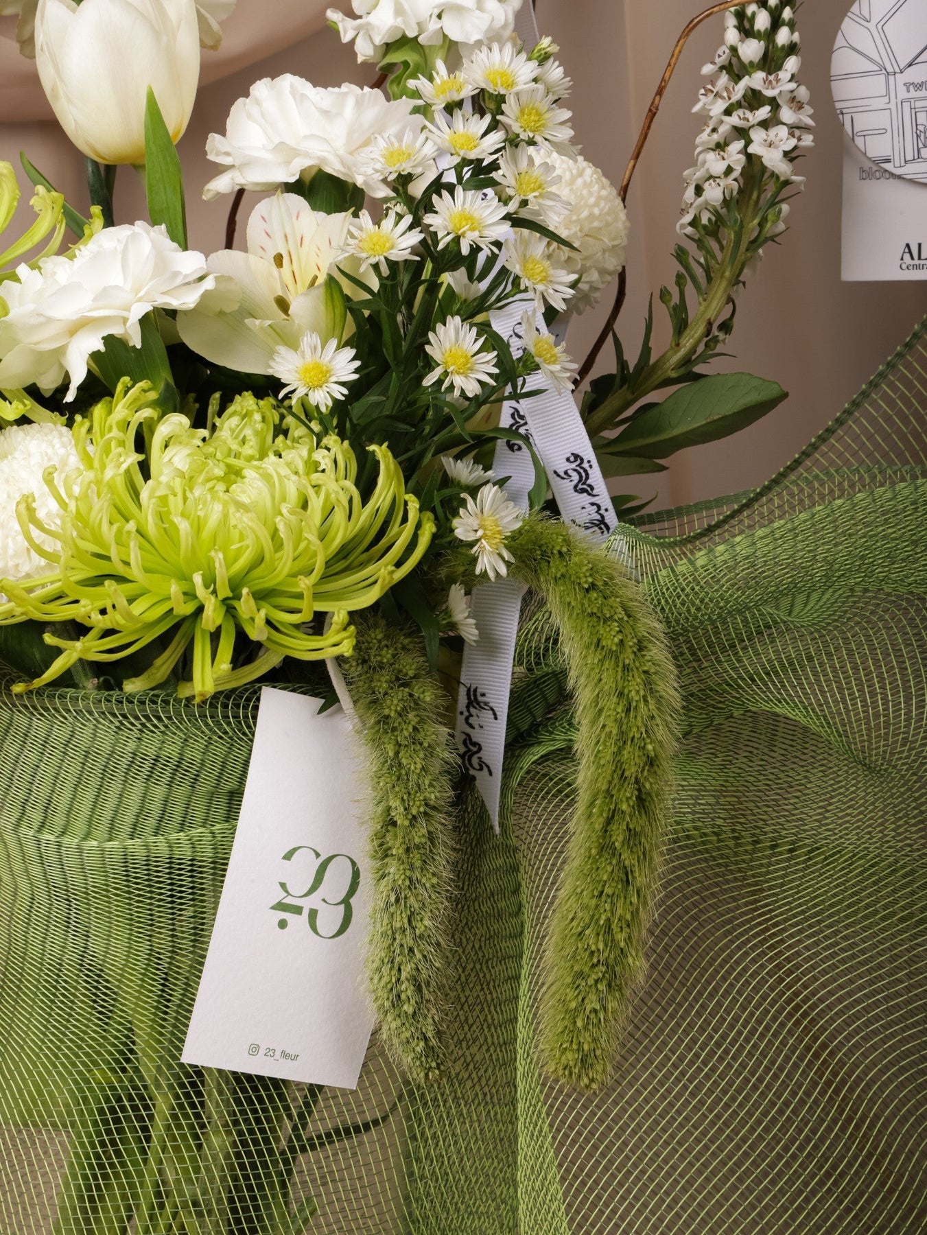 منعشة ومليئة بالحيوية، باقة "ليمو فريش" تجمع بين التوليب الأبيض، والأقحوان الأخضر، والبيلي القروي، وأزهار الأقحوان البرية. ملفوفة بشبك أخضر ناعم يضفي لمسة فنية أنيقة. مثالية لنشر الأمل والنور في أي مكان.