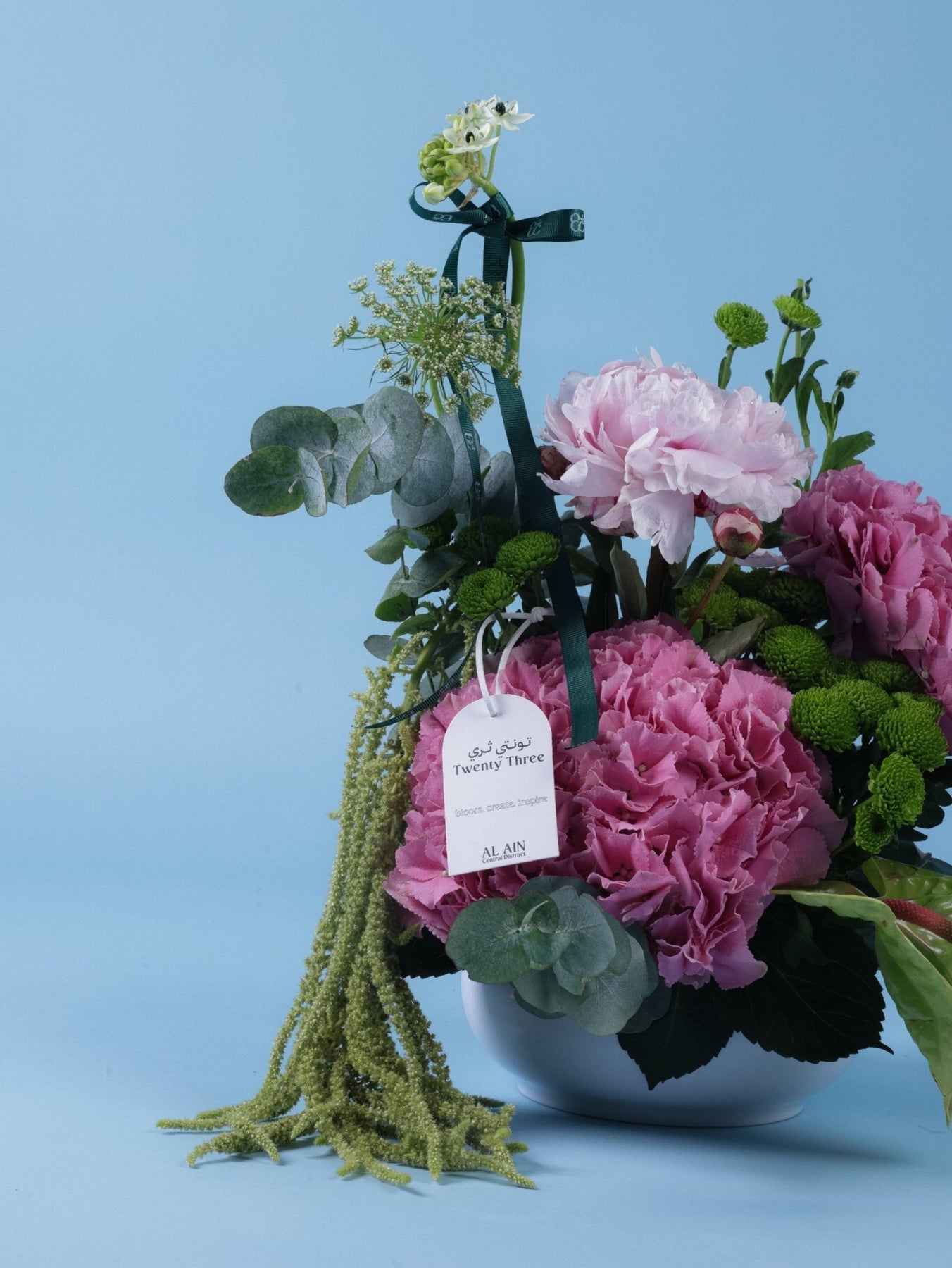 تنسيق أنيق يجمع بين الفاونيا الوردية الناعمة، والهيدرانجيا الفاخرة، ولمسات خضراء مبهجة في فازة بيضاء دائرية. مثالي للتعبير عن الامتنان أو المشاعر الراقية.