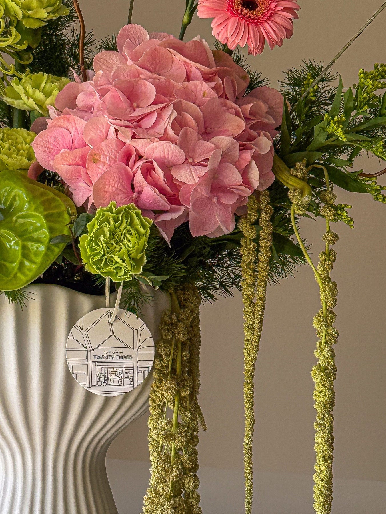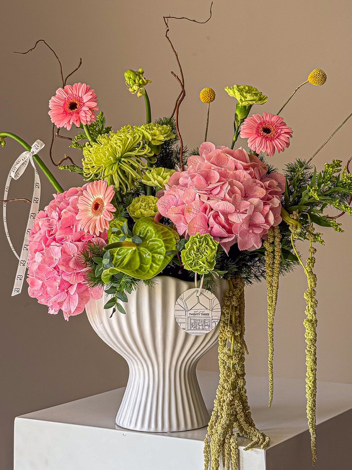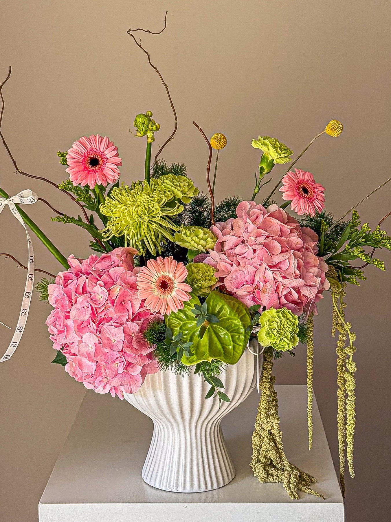 A graceful and artistic floral arrangement designed in our signature textured white ceramic vase. This piece blends soft pink hydrangeas with lively green chrysanthemums and anthuriums, accented by playful gerbera daisies and touches of yellow craspedia.