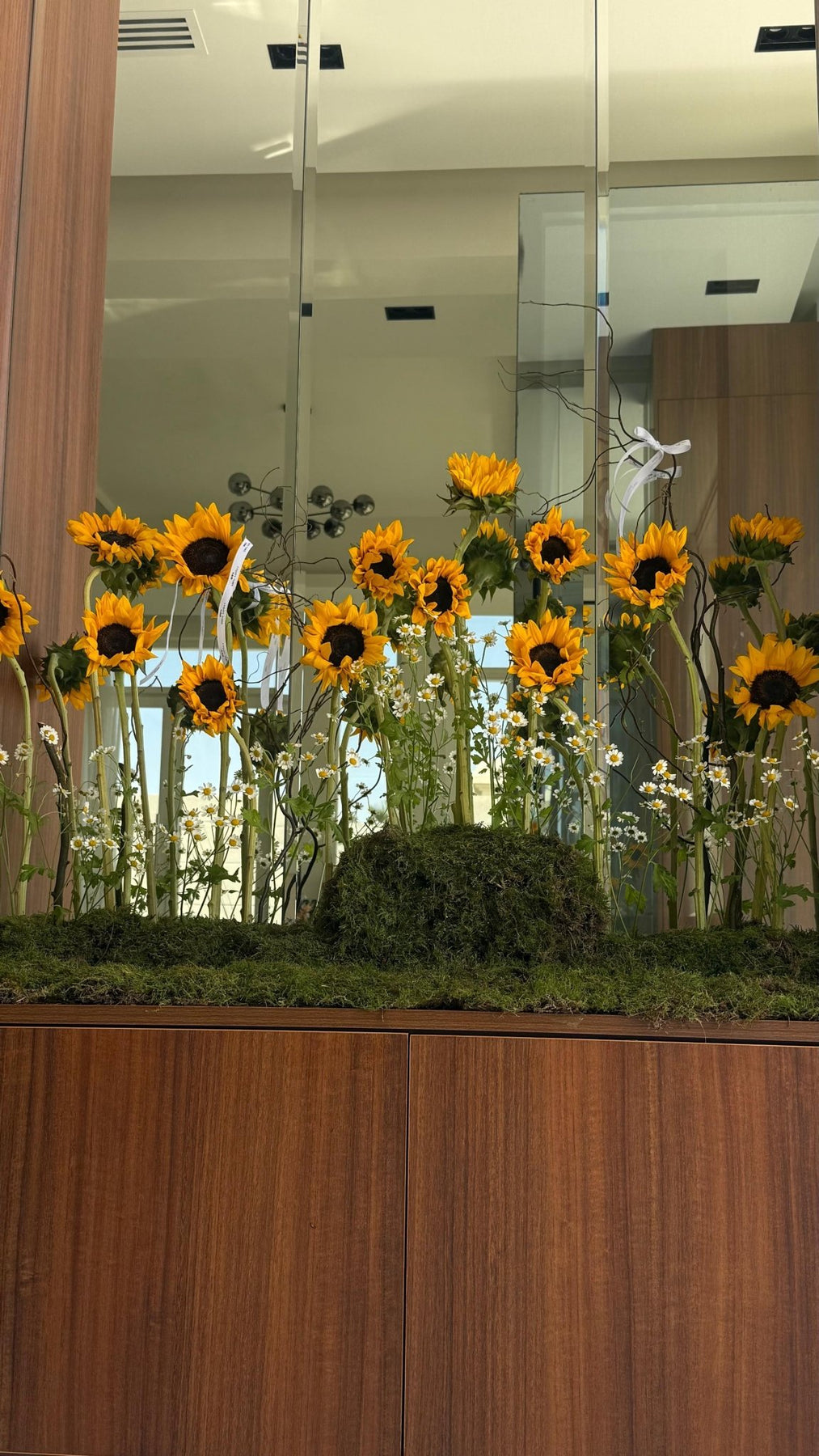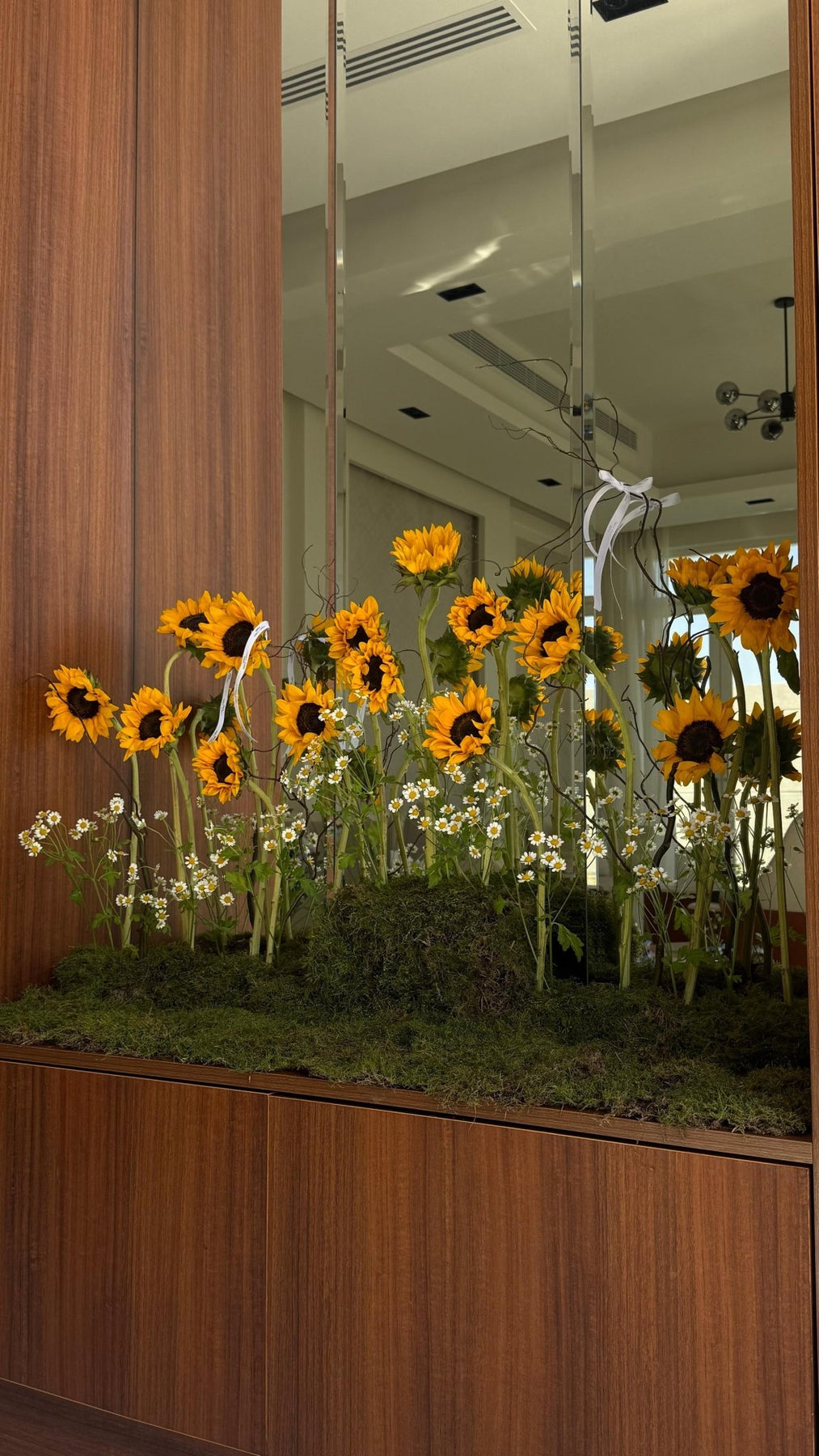 تنسيق طاولة ملفت من دوار الشمس والبابونج، منسق على العشب الطبيعي — مثالي لإضفاء البهجة على المجالس أو صالات الاستقبال.