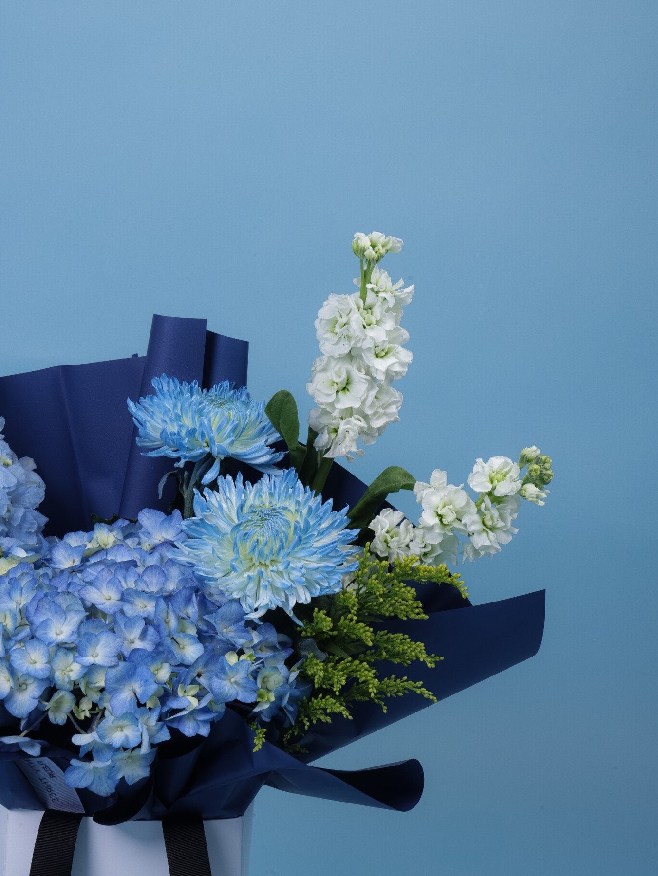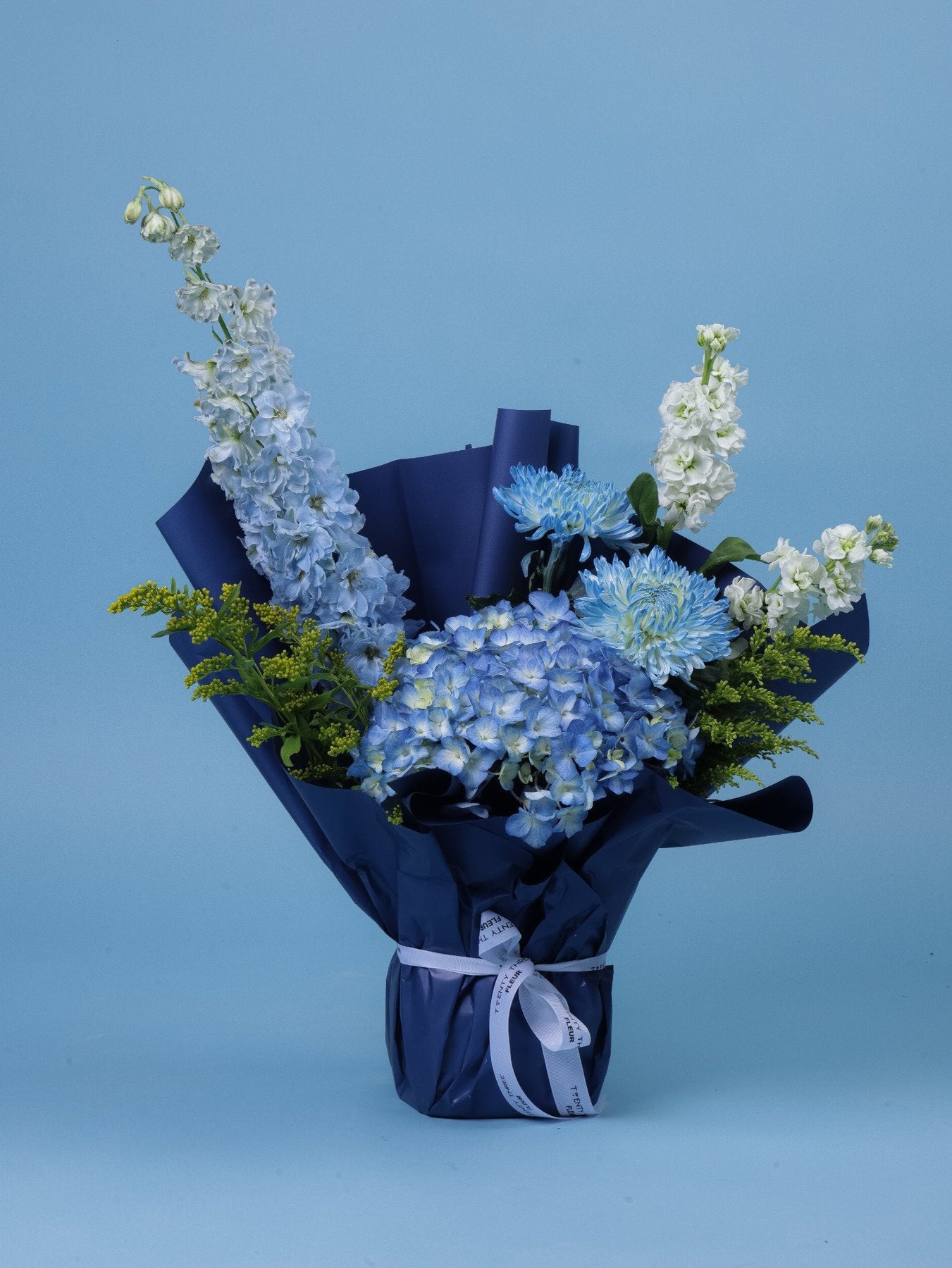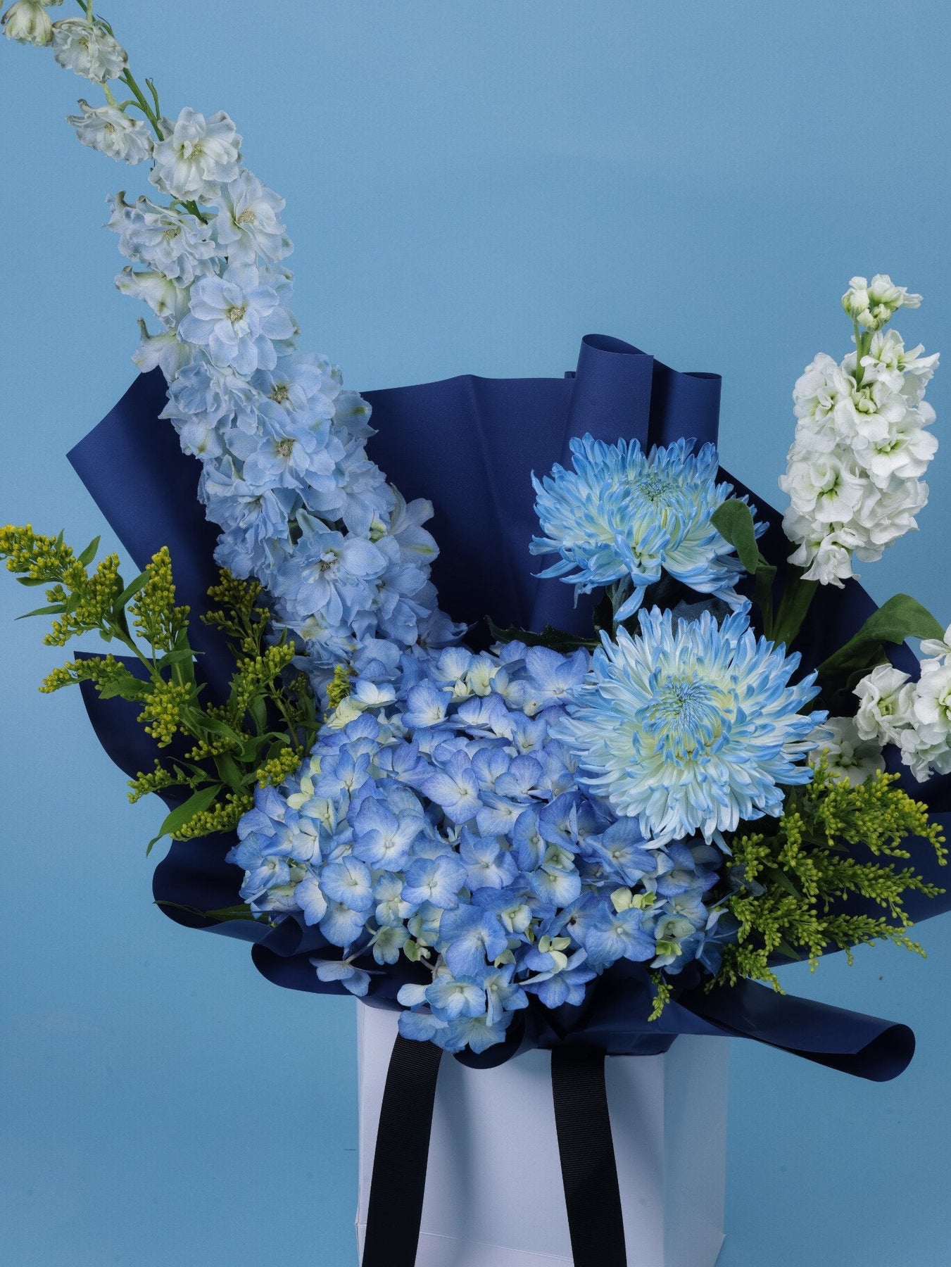 A calming blend of blue hydrangeas, sky-colored chrysanthemums, and white delphiniums. Wrapped in deep navy tones, this bouquet is perfect for elegant moments, sympathy, or expressing peaceful thoughts.