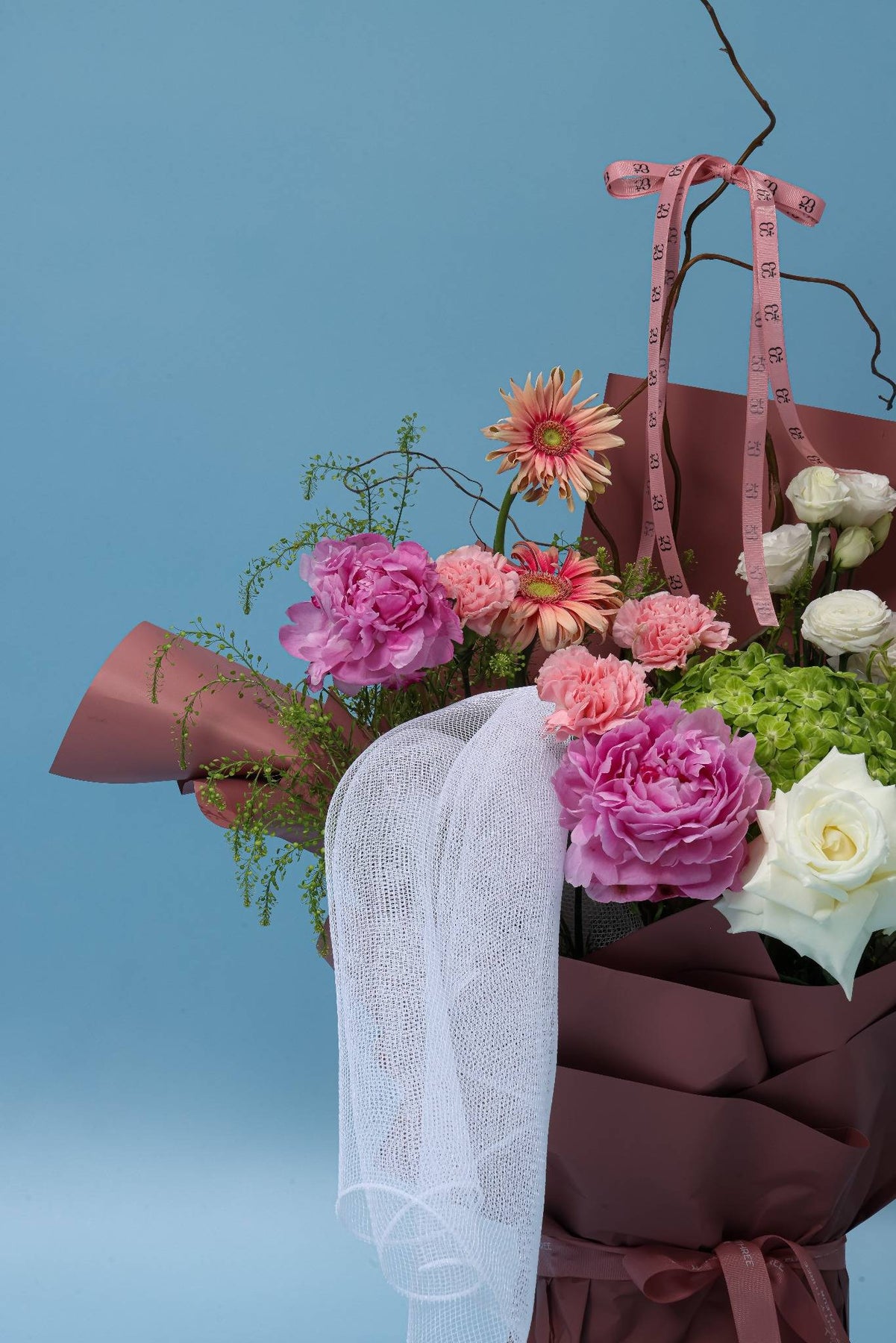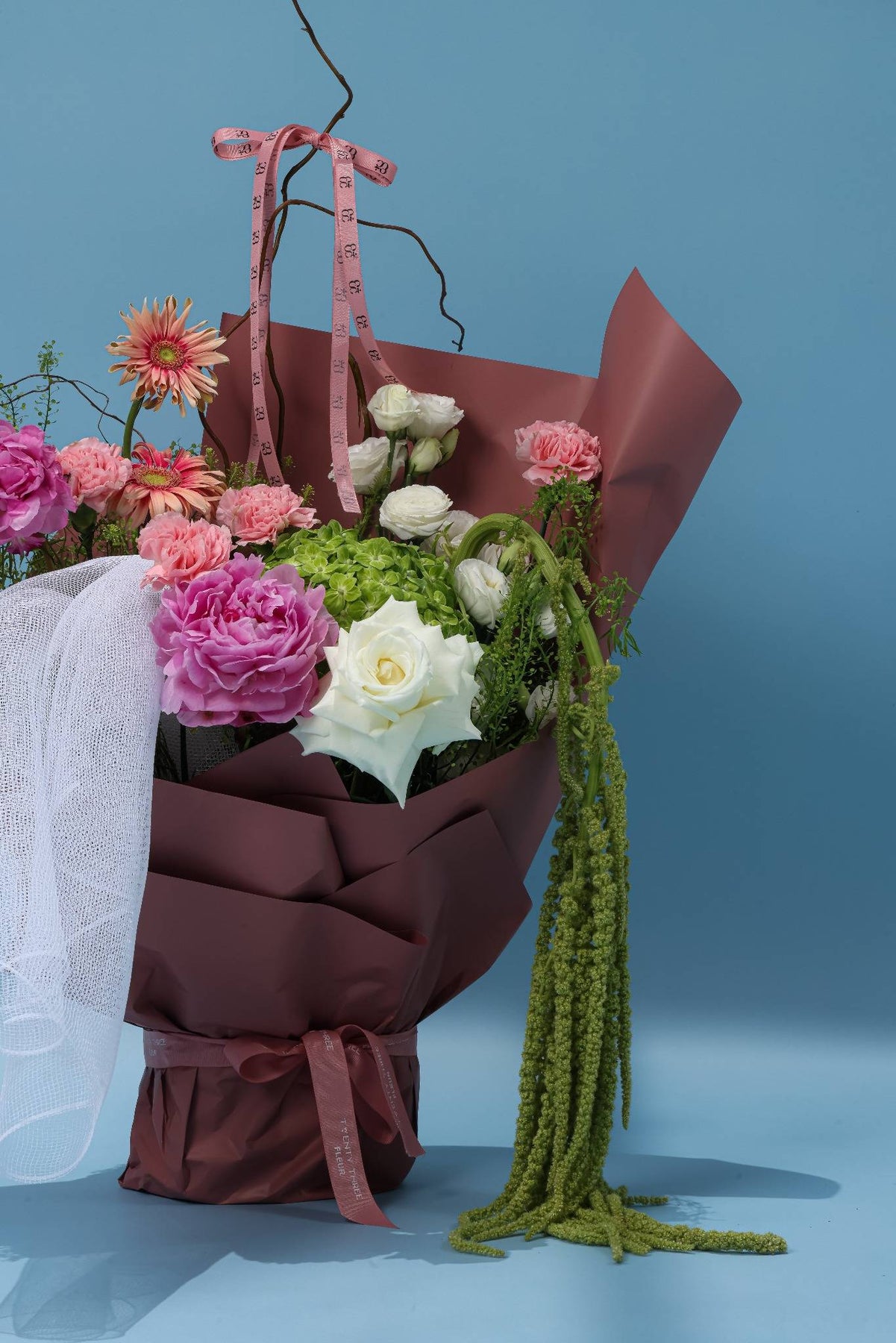 A whimsical, fashion-inspired bouquet that blends couture creativity with botanical beauty. Featuring pink peonies, garden roses, lisianthus, gerbera daisies, and crisp hydrangeas.